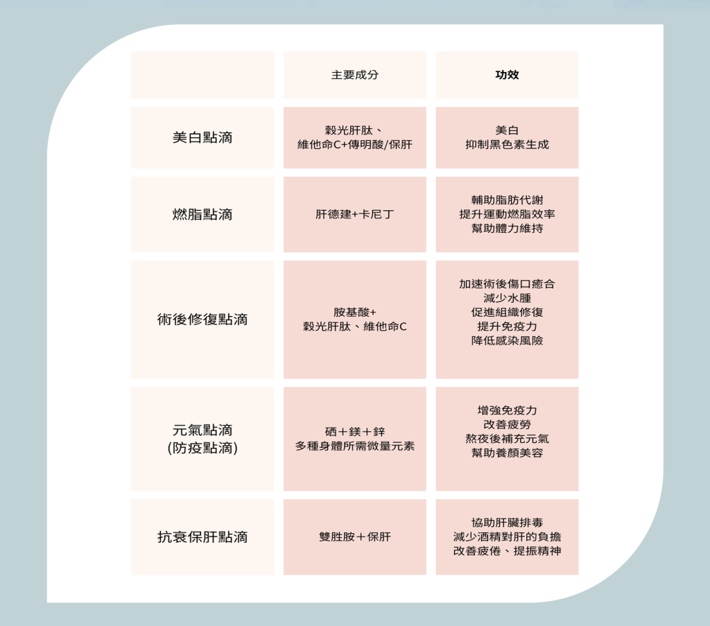 改善新陳代謝 排除體內毒素 胺基酸: 人體必需胺基酸,能量補充,活化細胞高單位維他命C: 幫助氧化還原、美白淡斑、改善皮膚,促進膠原蛋白生成維他命B12: 維持神經系統健康、促進血液循環、紅潤膚色穀胱甘肽: 細胞內清除自由基,抗氧化樞紐傳明酸: 抑制黑色素,提亮膚色及淡化斑點保肝: 強化肝臟排毒,促進新陳代謝治敏健: 抗過敏作用,並有免疫調節作用,抑制病毒繁殖 亮白膚色:若含有穀胱甘肽(Glutathione)、維他命C、傳明酸等成分,能減少黑色素生成,使膚色均勻透亮。抗氧化、延緩老化 :胜肽、維他命C、穀胱甘肽等成分具抗氧化能力,可減緩自由基對肌膚的傷害,幫助延緩細紋與鬆弛。 促進膠原蛋白生成 :部分胜肽(如六胜肽、銅胜肽)可刺激膠原蛋白合成,讓肌膚更緊緻有彈性。加速代謝與排毒 :維他命B群與穀胱甘肽能促進肝臟解毒、改善疲勞與暗沉,使氣色更好。 提升術後修復力 :在醫美術後注射,有助於減少紅腫、提升肌膚修復速度、降低敏感不適。