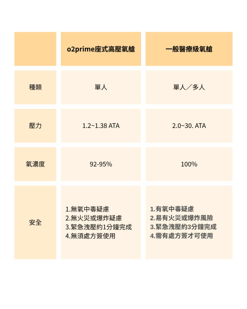 提升免疫力 促進新陳代謝 術後恢復 什麼是高壓氧? 早期的高壓氧,時常用於治療動脈氣體栓塞症、潛水夫病,不過現在已廣泛用於各項醫療領域。尤其是COVID-19新冠肺炎肆虐後,不少醫療院所也將高壓氧用於治療患者缺氧、抑制病毒活動上。使用高壓氧艙時,患者處於1-1.3絕對大氣壓的環境中,吸入100%純氧,使血液中氧氣分壓增加,紅血球含氧量達到飽和,並加速血漿中的氧氣溶解,增加血液含氧量,輔助提高人體內的含氧量並促進新陳代謝,使缺氧的組織活化起來,並提升傷口的癒合修復力,同時高壓氧也具有抑制細菌生長、殺死細菌、排除體內毒素的作用。 當代美學診所引進高規格高壓氧艙,能夠舒適的伸展手腳,以坐姿、躺姿享受。在經由專業醫師評估後決定絕對大氣壓力數值,除了加速術後修護,也可做日常保養使用。 身體慢性缺氧的狀態 高壓氧的好處 高壓氧適合對象 免疫力差,新陳代謝慢醫美術後,泛紅腫脹,傷口癒合運動後修復,肌肉痠痛慢性疲勞症候群睡眠品質不佳 坐式高壓氧艙 進行高壓氧治療前的注意事項 1. 請勿攜帶易燃物禁入艙內(香菸、打火機) 2. 治療前1小時,避免飲用汽水、啤酒等碳酸飲料或產氣食物,以免造成腸胃不適。 3. 治療前2小時,避免抽菸,抽菸會引起血管收縮,降低高壓氧的治療效果。 4. 進入艙內治療前,請取下身上金屬飾品、隱形眼鏡,並減少髮油、定型液、化妝品等物的使用。 我可以做高壓氧治療嗎? 是否適合,建議前來當代美學診所,醫師將依您個人身體狀況,提供客製化的專屬療程。 療程需要多久時間? 單次療程約60分鐘,所需次數可依個人身體種況進行評估,也可做為日常保健療程定期操作。 誰不適合高壓氧治療? 1. 自發性氣胸、胸腔或耳部重建手術的病史發燒 (氧中毒風險) 2. 對氧氣過敏或有氧中毒病史者 3. 感冒和鼻炎引起鼻塞,耳朵疾病者 4. 幽閉症的患者5. 懷孕中婦女 6. 裝有心律調節器(Pacemaker)的患者 7. 癲癇患者 8. 肺氣腫伴有二氧化碳滯留