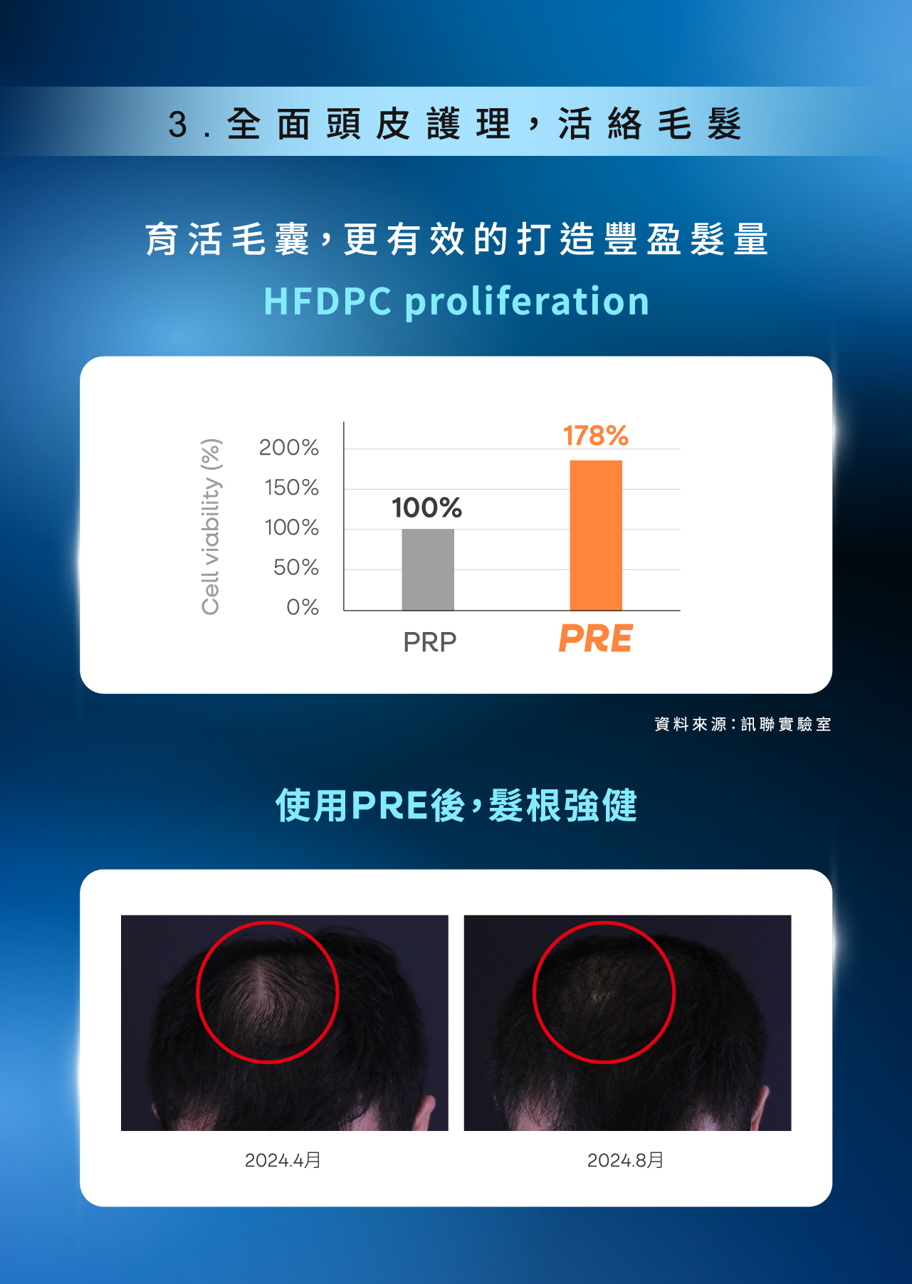 pre 發佈留言 / 最新消息 / 作者: timebeauty 台灣再生醫學大廠訊聯帶領 PRP升級至嶄新時代,推出PRE,為傳統PRP升級版,其自體來源,產品無任何添加物,嚴格把關安全性。 PRE能免疫調節、調理肌膚、強健髮根。 PRE是一項利用自體血液製作的外泌體療程。在我們當代美學診所中,由護理師抽取約 150cc 的血液,送至訊聯公司進行專業培養,製作出專屬於自己的外泌體。相比市售外泌體產品(每瓶約含 300 億~1,000 億顆),自體製程的外泌體可高達每瓶 1 兆顆,顆粒數大幅提升,效果自然更顯著。 PRE優勢 高相容性:因為來自自身血液,幾乎不會有過敏風險高濃度:每瓶高達 1 兆顆外泌體,遠超業界一般規格高效率:具備組織再生、修復功能,療效更明確一次抽血,製作 12 瓶,可依需求分區使用臉部保養:適合膚質敏感、希望改善老化、提升彈性者頭皮療程:適合頭皮敏感、生髮育髮需求者 PRE製作過程 適合對象 免疫功能失衡、生活壓力大者。想改善膚質,實現肌膚年輕化的您。有頭皮問題或掉髮困擾的顧客,期待重現健康髮量。 Q1. PRE與PRP差異 項目PRP 生髮療程PRE 生髮療程全名Platelet-Rich Plasma(高濃度血小板血漿)Protein-Rich Exosome (高濃度血小板血漿+外泌體)成分來源抽取自體血液 → 離心後取出富含血小板的血漿PRP + 自身外泌體作用機制血小板中的生長因子促進毛囊修復與血液循環在 PRP 基礎上強化毛囊再生與抗老化效果濃度與效力標準濃度血小板含強化生長因子,濃度更高建議療程次數每3-4週1次,共 3~6 次為一個療程每3-4週1次,共 3~6 次為一個療程適合對象初期掉髮、產後落髮、髮質變細者想強化效果、過往 PRP 效果不顯著者價格較平價,一次約 NT$9,000~15,000較高,一次約 NT$15,000~25,000恢復期1~2 天,幾乎不影響作息1~2 天,幾乎不影響作息 Q2. PRE用於生髮療程 PRE 是一種在 PRP(高濃度血小板血漿)基礎上再進一步升級的療程,它會先從自體血液中抽取出血小板,與自己的外泌體因子,讓整體活性成分濃度更高,更能有效活化毛囊、延長毛髮生長期。這種療程需要抽血與注射,因此過程中會有些微的不適,但相對也更適合掉髮比較明顯、有家族性雄性禿,或是曾經做過一般PRP但效果不夠顯著的人。 Q3. PRE生髮會痛嗎? 簡單來說,會有一些不適感,但大多數人都可以接受,而且診所通常會搭配適當的舒緩處置,大幅降低疼痛程度。療程後有些人在療程結束的1~3天仍會感到些許的脹痛,需保持頭皮清潔,並透過服用口服止痛藥,以及在施打的部位塗擦藥膏,改善療程結束後的疼痛狀況。