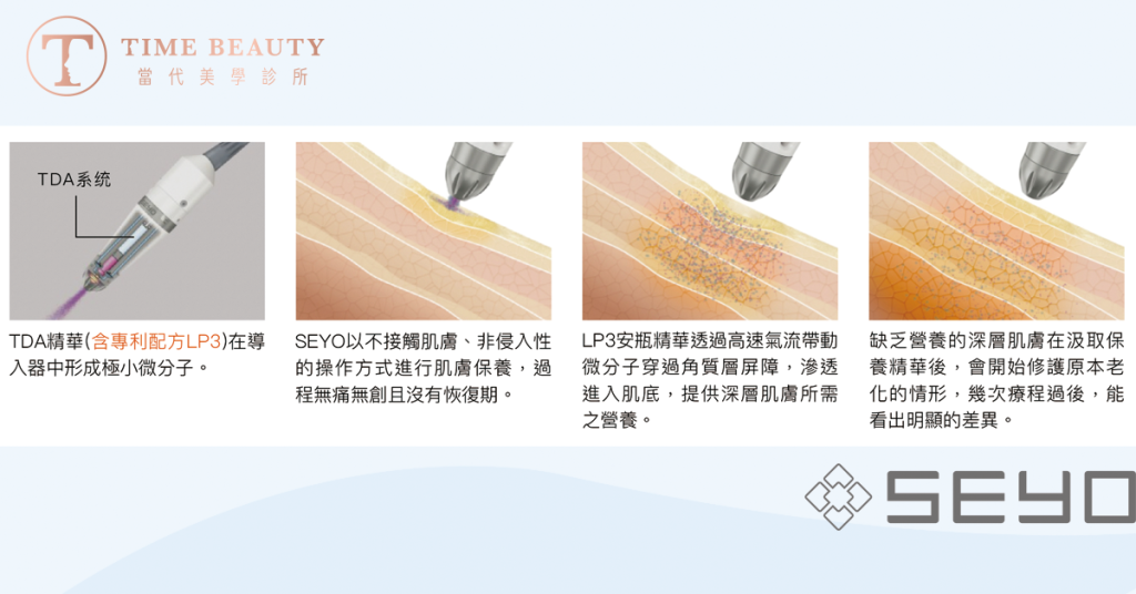 Dcard大推的無針水光是什麼?與韓國水光針差異比一比 / 最新消息, 精緻微整 / 作者: 李 冠臻醫師 你是否正在為乾燥的肌膚、暗沉的膚色以及日漸浮現的細紋和皺紋感到困擾?現代生活中的習慣與空氣污染,讓肌膚難以維持健康光澤。每次看著鏡中的自己,是否因失去彈性的肌膚、臉上細紋、卡粉浮粉、臉泛油光而沒有自信? 維持好肌膚狀態的三大要素:防曬、保濕、清潔 防曬 陽光中的紫外線會加速皮膚老化,UVA能夠穿肌膚表皮和真皮層,長時間下來會對皮膚彈性纖維造成傷害,使皮膚開始變得鬆弛、紋路加深和黑色素沉澱;UVB則會讓皮膚曬傷,角質層受損變得乾燥,失去光澤。 保濕 當角質層中的含水量和脂質足夠時,就能維持水潤柔嫩的肌膚狀態,但若肌膚處於長期缺水的狀態,就會因為乾燥而出現脫皮掉屑,造成肌膚觸感粗糙且有顆粒感,細紋也會隨之找上門,加速老化現象。 清潔 徹底清潔能有效去除污垢、油脂和殘留的彩妝,讓肌膚暢快呼吸,保持健康和活力。 德國SEYO水光儀 | TDA無創透皮技術 來自德國的seyo水光儀,又被稱作「無針水光儀」、「德國水光機」,是一種非接觸式、無痛、零恢復期的先進儀器,利用TDA專利無針透皮技術,讓保養精華液霧化到極小分子,以高壓、高速的噴射方式肌膚真皮層,讓保養精華深入肌膚。非侵入的操作就達到媲美微針效果的療程。 seyo水光儀3大優點:無痛、高效、客製化 1. 無痛:透過專利技術與高壓噴射,將肌膚角質層打開,是一種非侵入性的醫美保養療程,過程完全無痛,也沒有傷口,療程之後無修復期。2. 高效:療程大約12-15分鐘,非常適合講求高效率保養的愛美人士,一個午休時間,幫自己膚100片面膜。3. 客製化:seyo一共有10種專利技術安瓶,從保濕、抗痘、抗敏、抗衰、淨白、急救舒緩、頭皮、美甲、私密處保養等,可以針對近期膚況以及部位去做挑選,也可以兩者搭配使用。 N5保濕 當代美學診所seyo無針水光療程 清潔皮膚:專業洗卸,徹底清潔面部,去除油脂和污垢。也可以搭配海菲秀3步驟,深度清潔。使用德國SEYO水光儀:利用微小氣泡技術將營養成分輸送至皮膚深層。手技導入:加速保養精華吸收。後續護理:治療後,應進行適當的保濕和防曬,以保持效果。 眾多皮膚專科醫師推薦-Seyo水光儀,依照您的膚況、年紀、全身適用去調整需要的安瓶精華,德國原裝進口更安心,許多人都會笑稱『噴完就像敷了一百片面膜』,深層、有效率的保養,是現代人在忙碌日常中需要的。